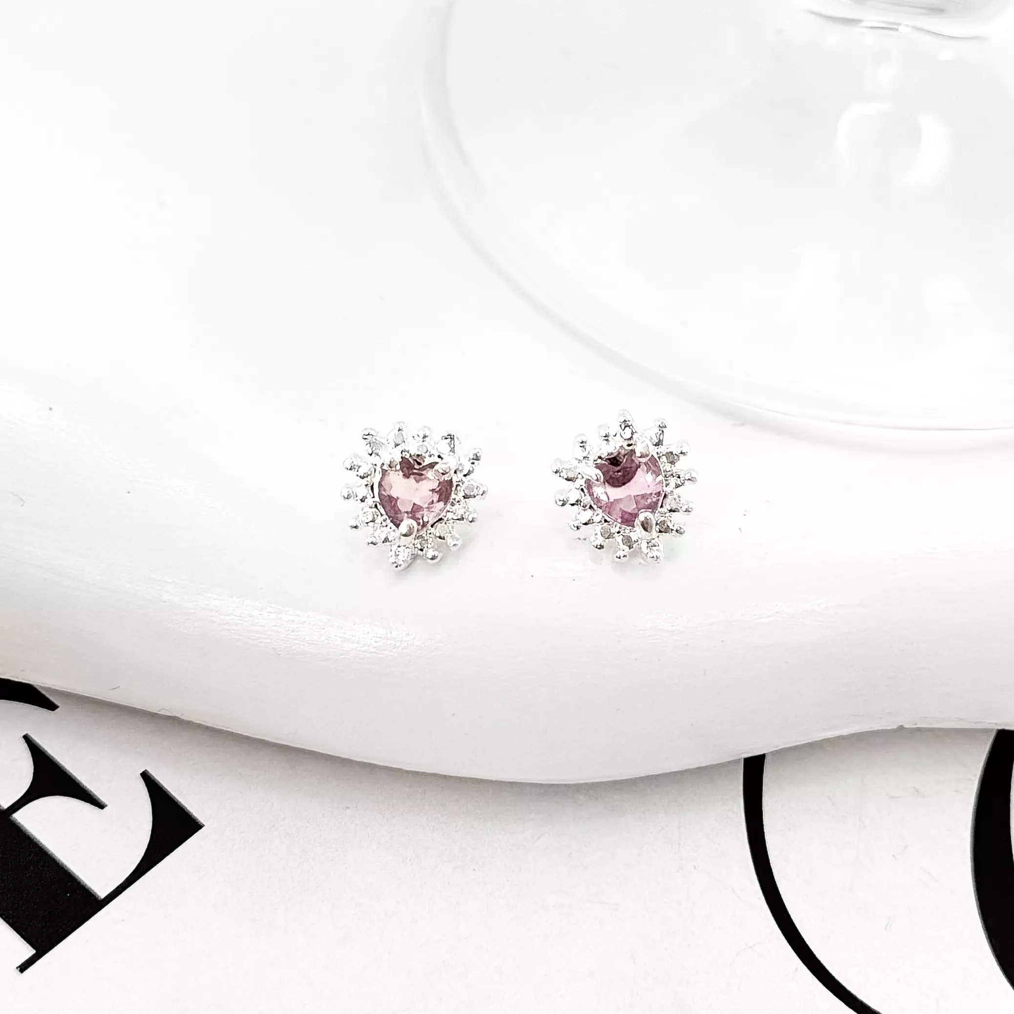 Brincos em formato de coração, na cor rosa claro, com borda detalhada.