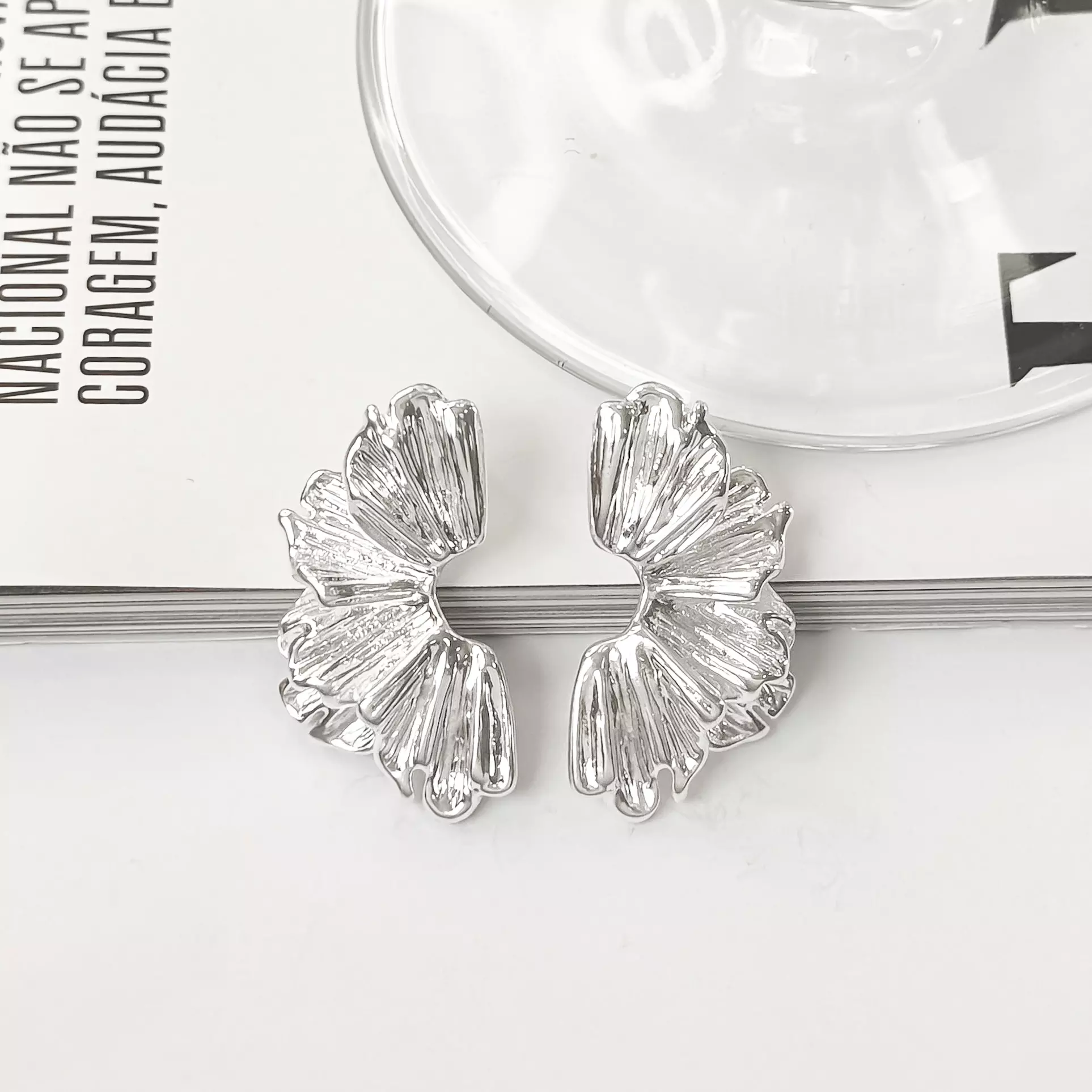 Brincos em formato de pétalas, com detalhes texturizados.